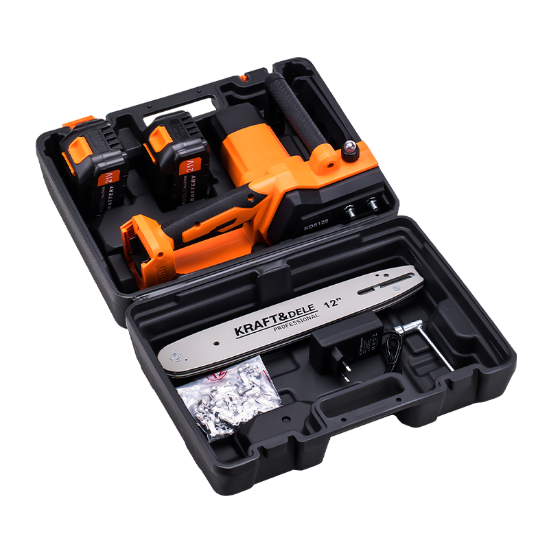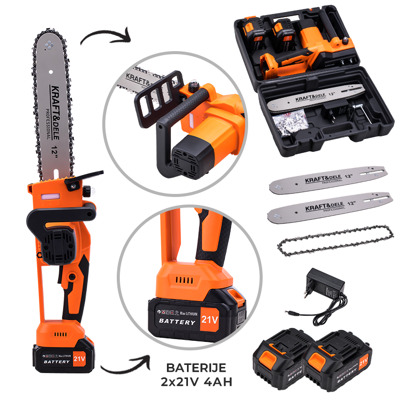 Profesionalna aku pila Kraft&Dele savršen je alat za rad u vrtu i voćnjaku. Zahvaljujući dvjema snažnim 21V 4Ah baterijama, pruža potpunu slobodu kretanja bez kablova i potrebe za gorivom. Idealan je izbor za rezanje grana, pripremu ogrjeva i manje drvne radove.