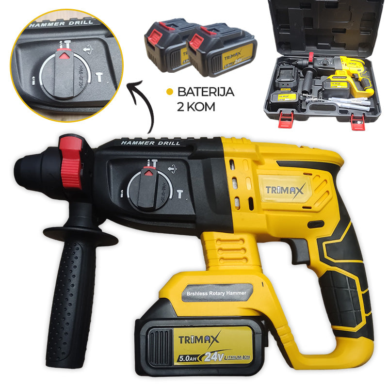 - Tri načina rada: TRIMAX udarni čekić dolazi s tri prilagodljiva načina rada: način bušenja za precizno bušenje u željezu ili drvu, način rada čekića za klesanje i lomljenje materijala te način bušenja s čekićem za bušenje čvrstih površina poput kamena.
