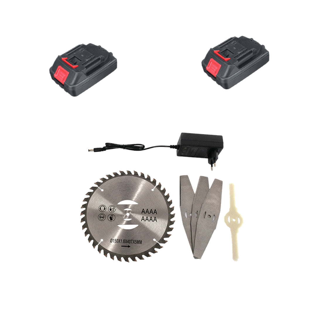 - Uključeni dodaci: traka za nošenje, cirkularna pila za rezanje granja, 3 noža za malčiranje, trajni nož za košnju trave, punjač, dvije baterije i ključ za montažu noževa.