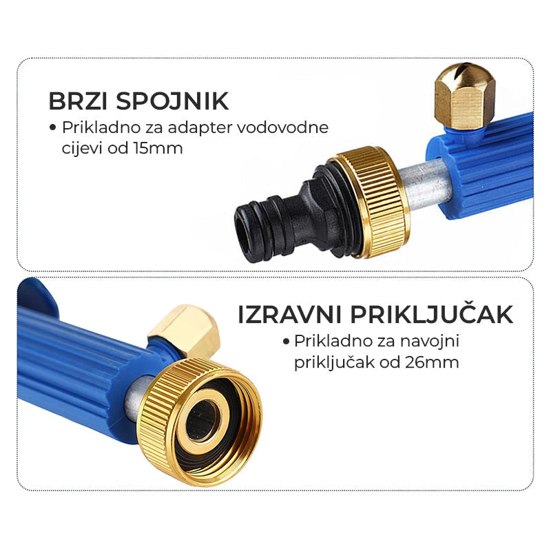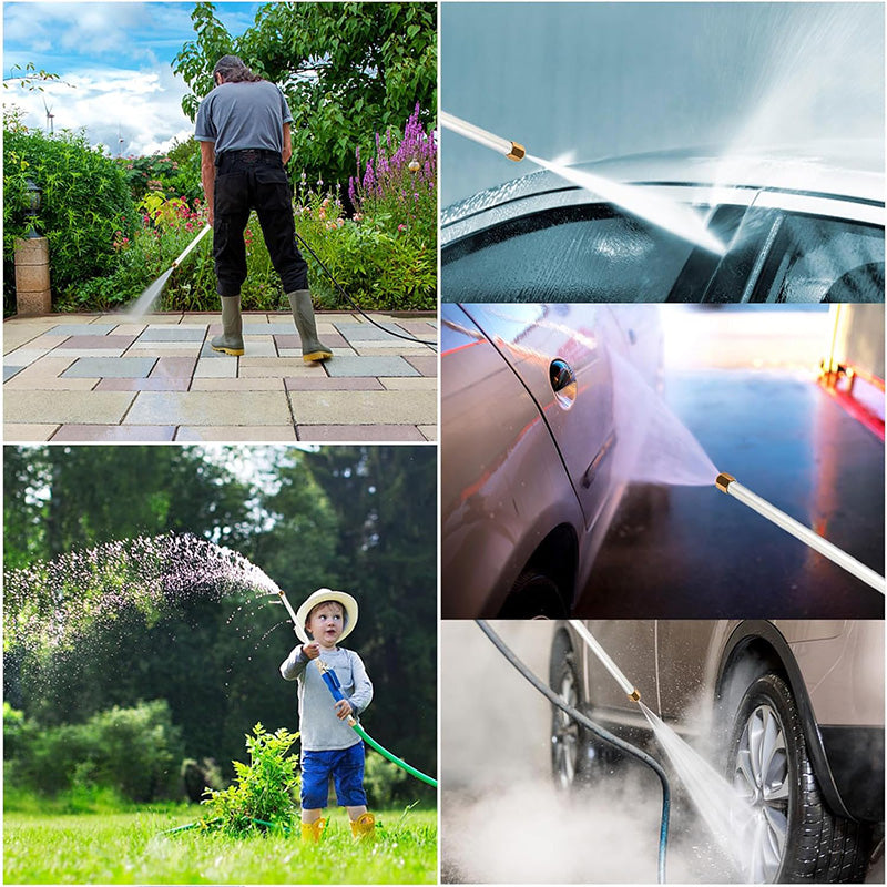 Jednostavna upotreba: Ova cijev za visokotlačno pranje odgovara svim ¾" standardnim vrtnim crijevima i može se koristiti s drugim veličinama pomoću standardnog 1" ženskog priključka za crijevo ili s električnim sustavom za pranje pod pritiskom pomoću priloženog adaptera.
