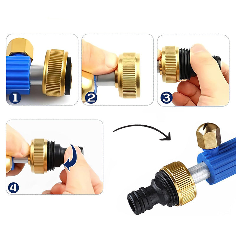 - Prilagodba: Odgovara svim ¾" standardnim vrtnim crijevima i drugim veličinama sa standardnim 1" ženskim priključcima za crijevo ili se može koristiti s električnim sustavom za pranje pod pritiskom pomoću priloženog adaptera.