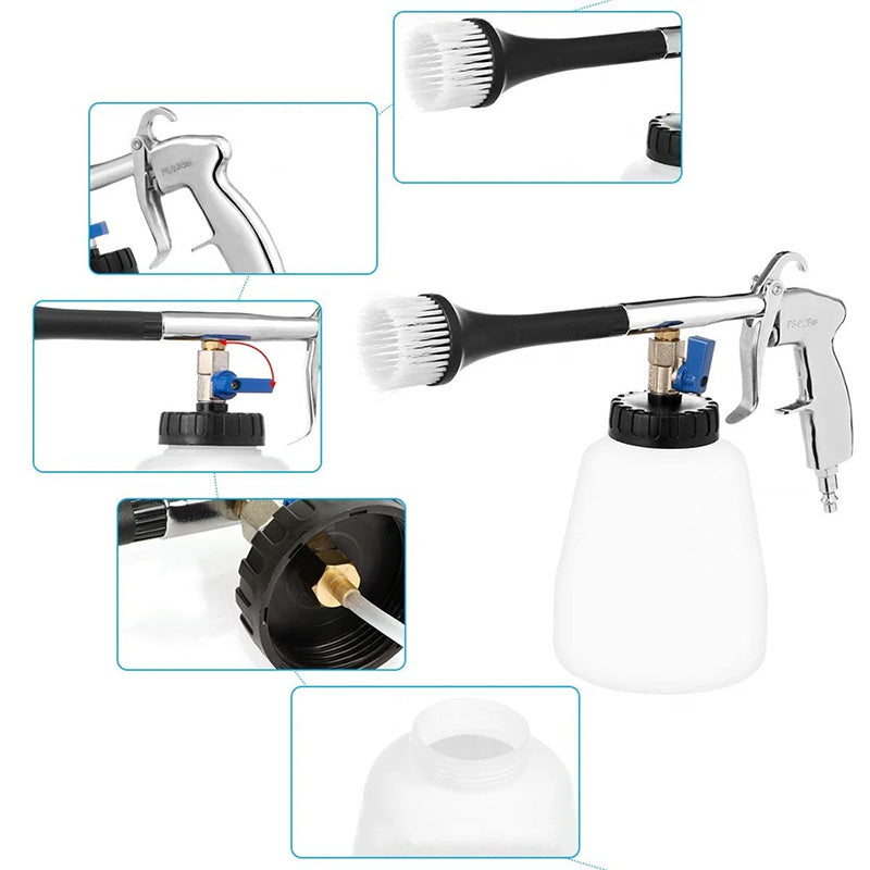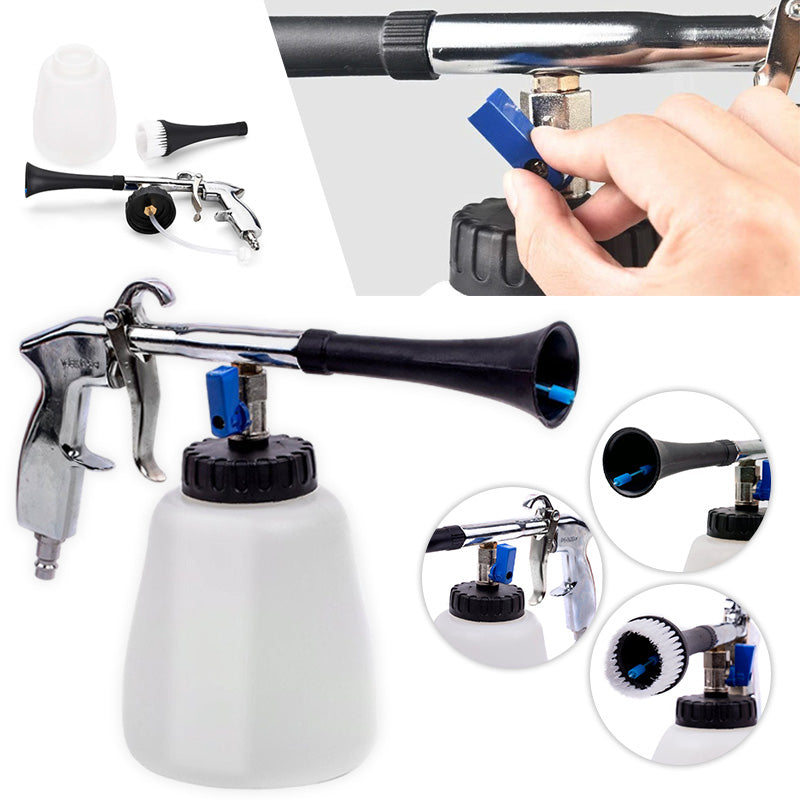 Ppneumatski pištolj za pranje s kapacitetom od 1 L, nezamjenjiv alat za dubinsko čišćenje tapeciranog namještaja i unutrašnjosti automobila. Dizajniran za mokro čišćenje, ovaj pištolj bez problema uklanja sve vrste prljavštine, od karoserije do unutrašnjosti vozila, uključujući ventilacijske otvore, klima uređaje, retrovizore, plastične elemente, sjedala, presvlake, tepihe te čak i najtvrdokornije mrlje i krhotine.
