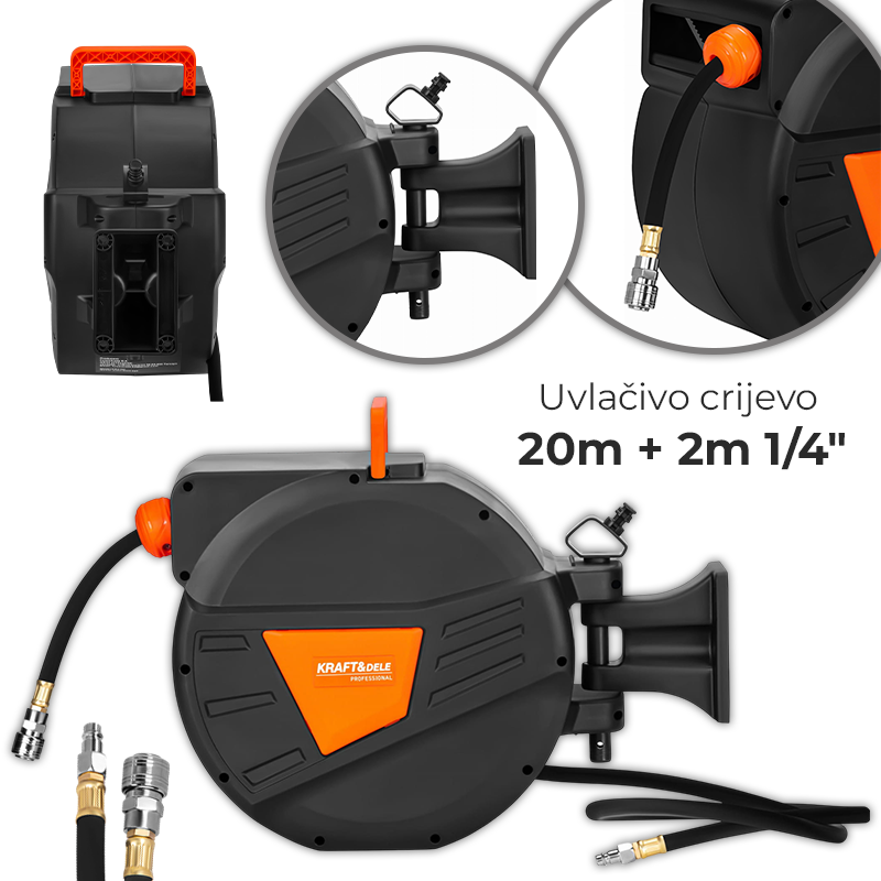 KD2159 je praktično pneumatsko crijevo marke KRAFT&DELE duljine 20 m + 2 m, smješteno na automatskom kolutu. Namijenjeno je radu sa komprimiranim zrakom u radionicama, servisima, garažama i proizvodnim pogonima.