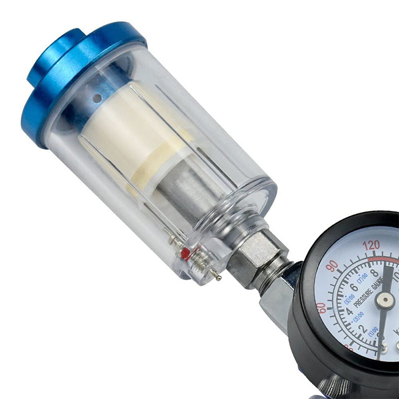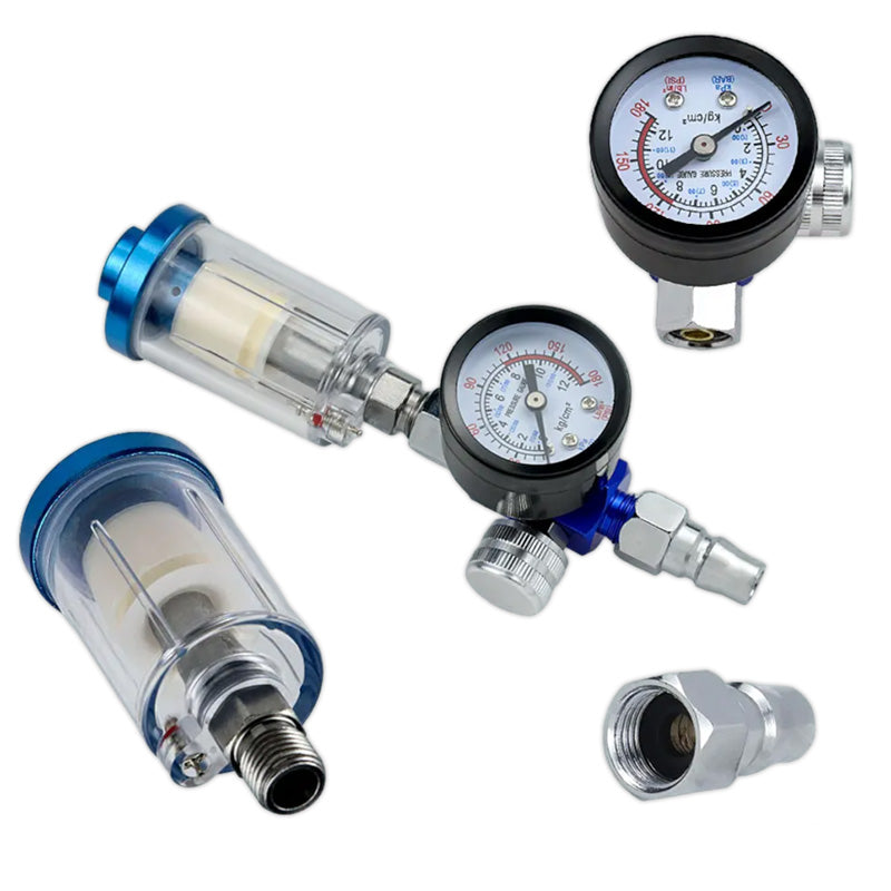 Regulator zraka s ugrađenim mini filterom za zrak idealan za profesionalce i entuzijaste koji žele postići bezprijekornu završnu obradu. Ovaj visokokvalitetni alat osmišljen je da filtrira vlagu iz zraka i regulira tlak, čime osigurava savršen rezultat lakiranja bez neželjenih nečistoća.