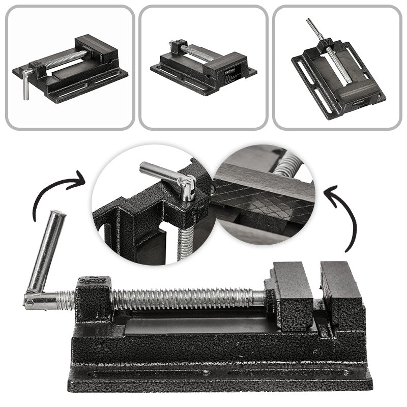 Strojni škripac 100 mm izrađen je od čvrstog lijevanog željeza i namijenjena je za precizno pozicioniranje i učvršćivanje materijala pod pravim kutem tijekom raznih strojnih i ručnih obrada. Zahvaljujući robusnoj konstrukciji i stabilnom prihvatu, nezamjenjiva je u poslovima kao što su rezanje, brušenje, bušenje i odvrtanje.