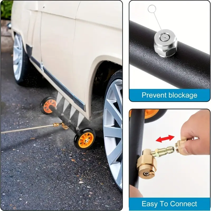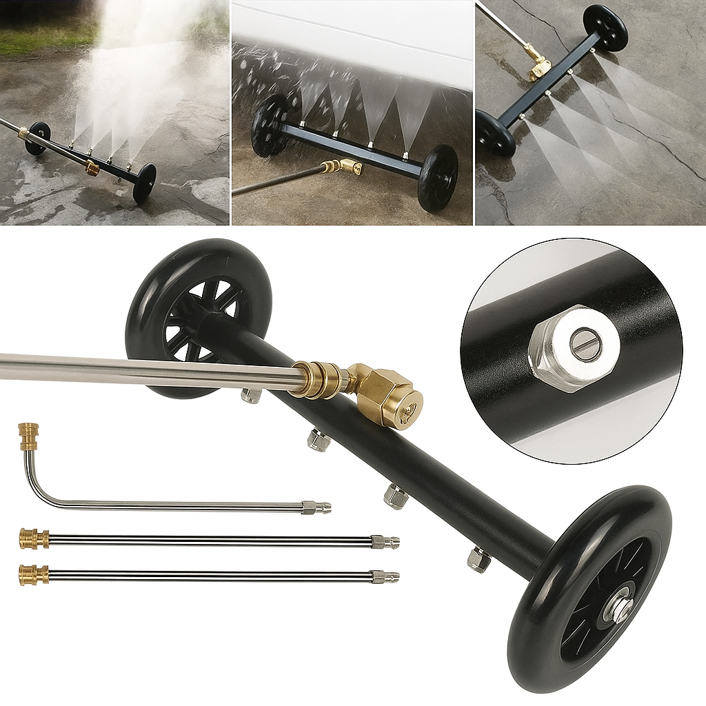 Visokotlačni metalni nastavak dizajniran za brzo i učinkovito čišćenje donjih dijelova vozila, kao i ravnih površina poput dvorišta, garažnih podova, prilaza i terasa. Opremljen je s više mlaznica koje omogućuju ravnomjernu raspodjelu pritiska i snažno uklanjanje tvrdokorne prljavštine.